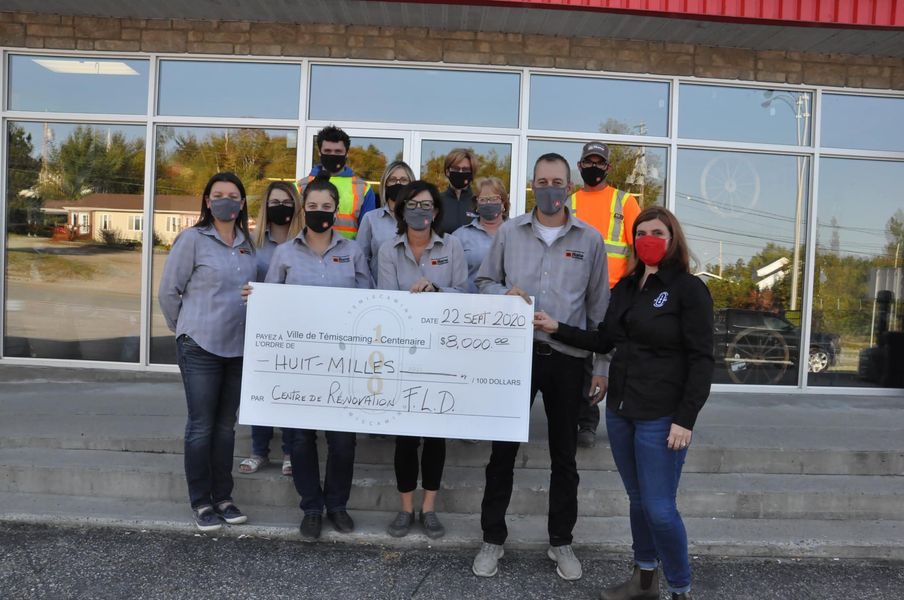 Francine et Luc Desrochers, propriétaires du centre de Rénovation FLD accompagnés par tous leurs employés, ainsi que Michelle Fortin Vice-Présidente du comité du Centenaire