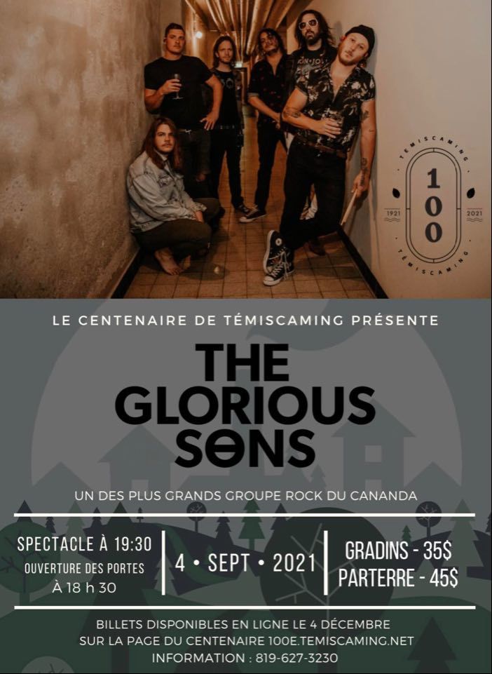 Nous sommes très fiers d'annoncer la tête d'affiche pour le spectacle du samedi, 4 septembre 2021. Témiscaming fêtera ses 100 ans avec l'un des plus grand groupe Rock au Canada: The Glorious Sons! Les rockeurs canadiens très énergiques sont originaires de Kingston en Ontario. Avec deux prix Juno et plus de 200 millions de streams mondiaux à leur actif, le groupe a fait le tour du monde, remplissant des stades à eux seuls et partageant la scène avec des légendes du rock, comme les Rolling Stones, The Struts, Greta Van Fleet et Twenty-One Pilots.