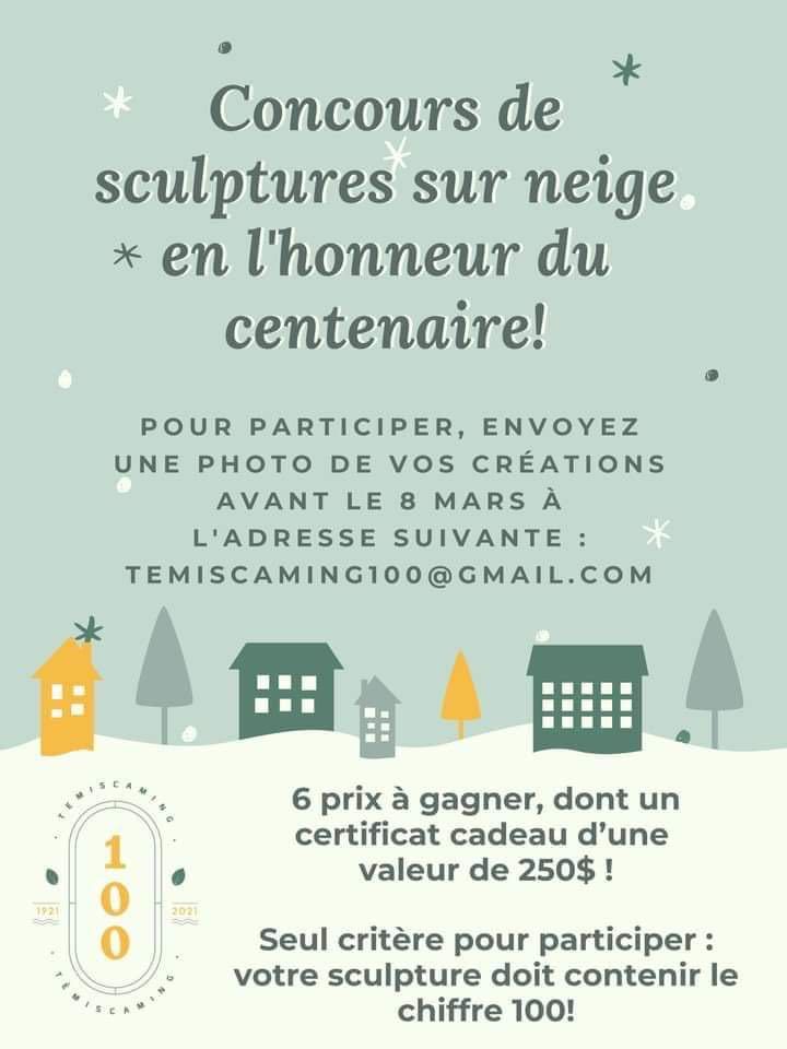 En hiver 2021, décorons Témiscaming avec des sculptures de neige ou de glace. Le seul critère pour ce défi est de voir le chiffre 100 intégré à vos créations!