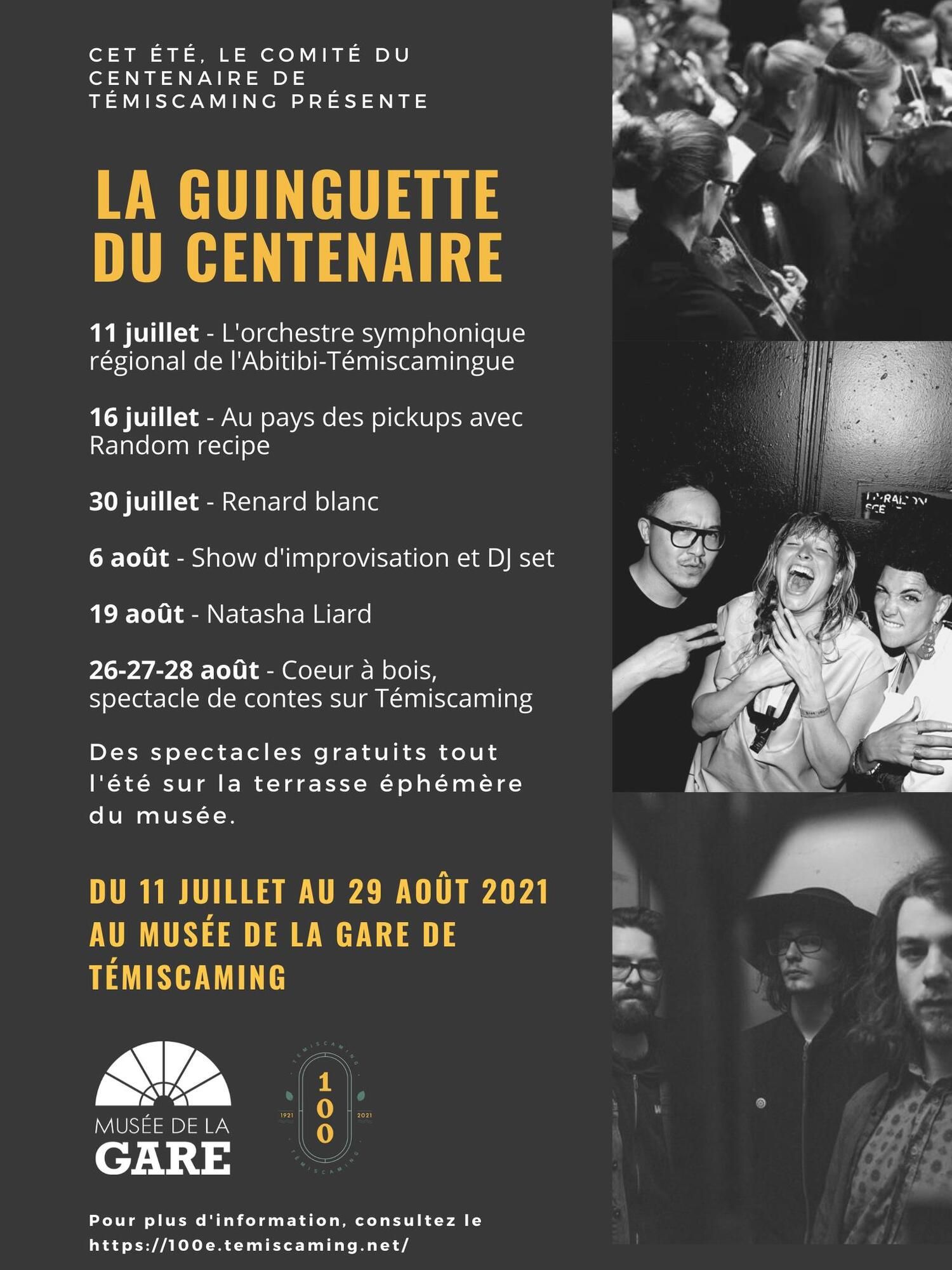 Le Musée de la gare est très heureux de présenter cet été, en partenariat avec le comité du centenaire de la ville de Témiscaming, la Guinguette du centenaire! Aussi partenaires du projet: le Réseau muséal d'Abitibi-Témiscamingue, la commission culturelle de la MRC du Témiscamingue et le Ministère des Cultures et Communications du Québec!